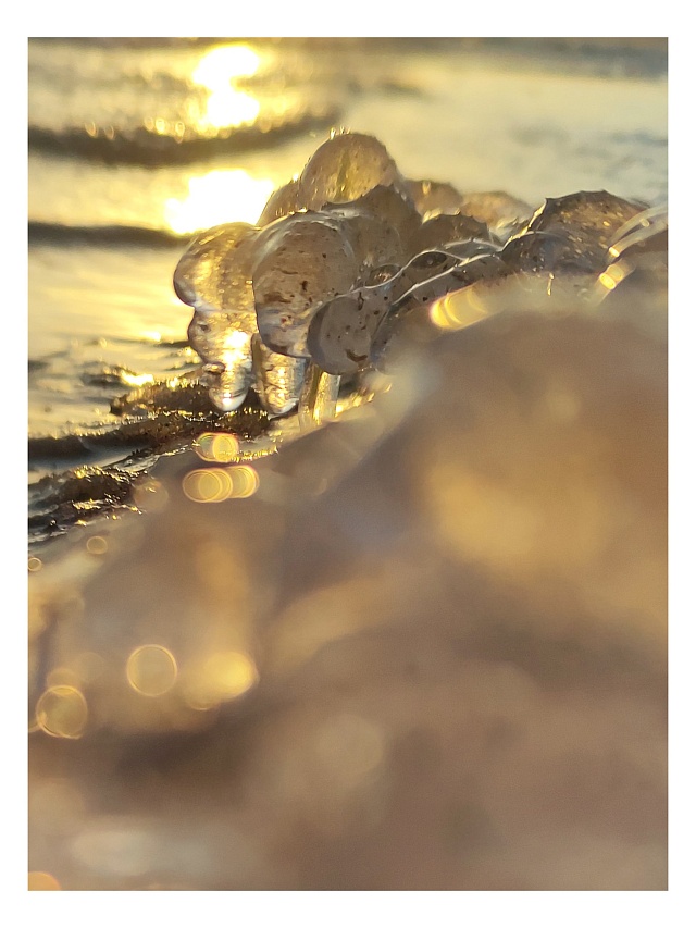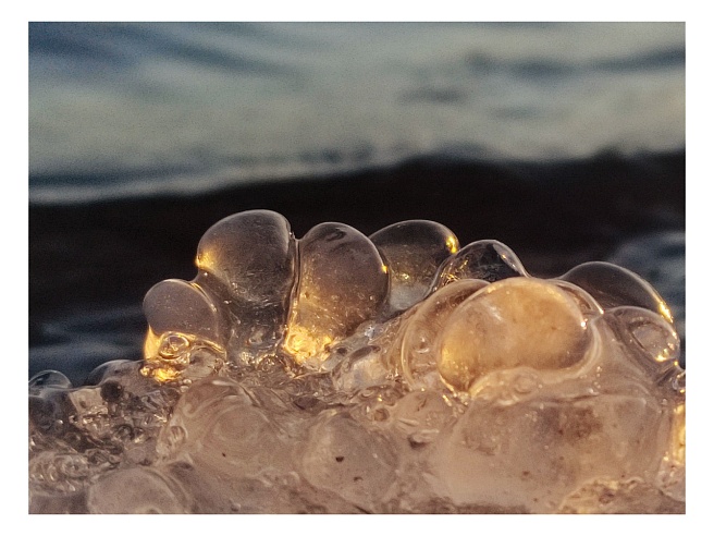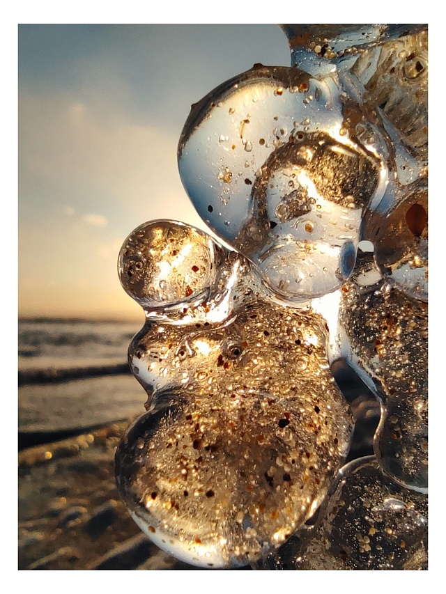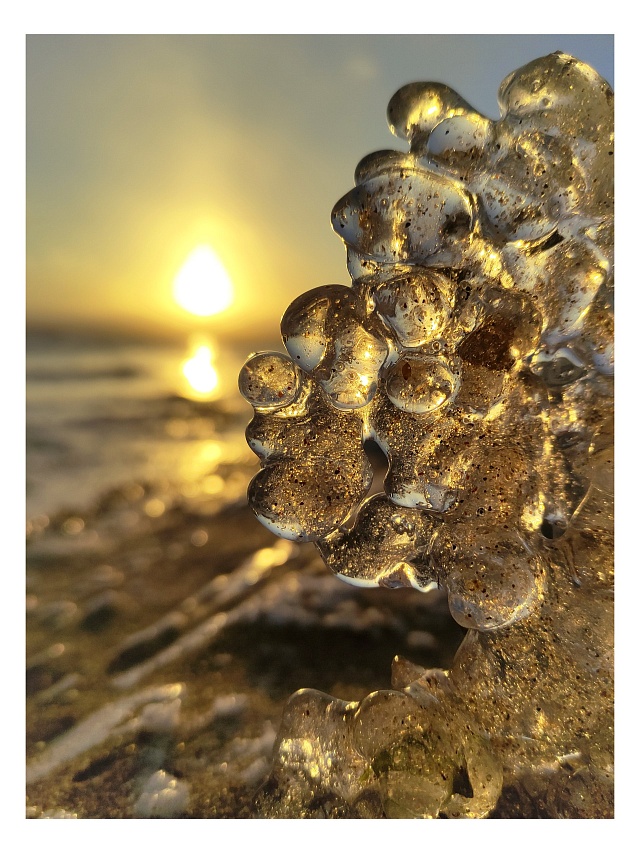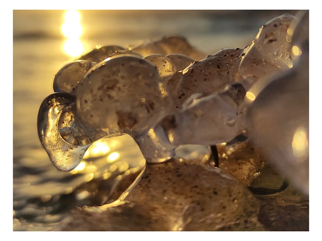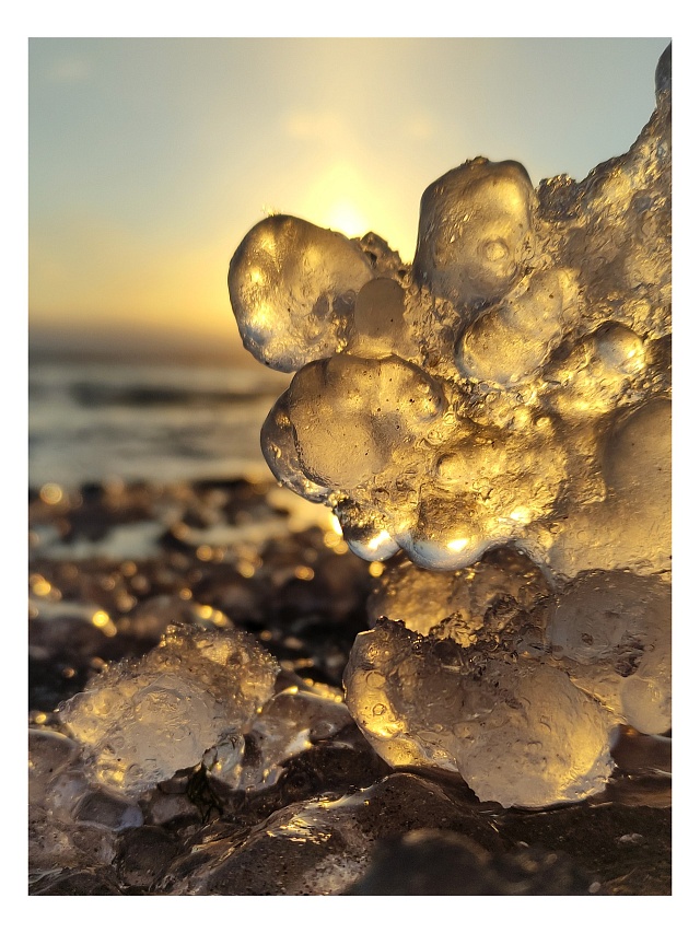 "Каждая такая гроздь — результат работы волн и брызг. Попадая на переохлаждённый берег, вода замерзает, формируя ледяные зёрна. Они растут, нарастают друг на друга, создавая эти мимолётные скульптуры", - отметил Червяков.
