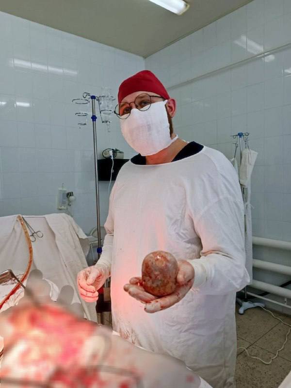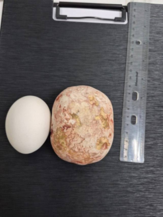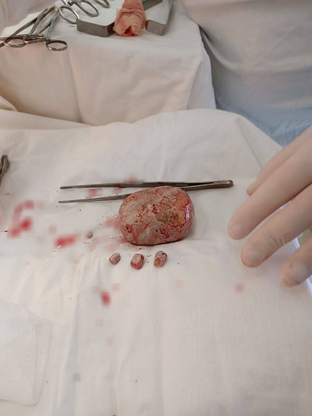 Больного экстренно прооперировали. Одной из операционных «находок» стал камень, весом около килограмма. Он занимал практически всю полость мочевого пузыря.